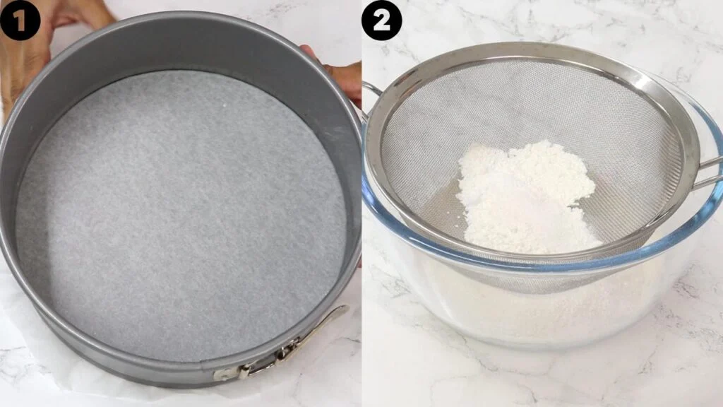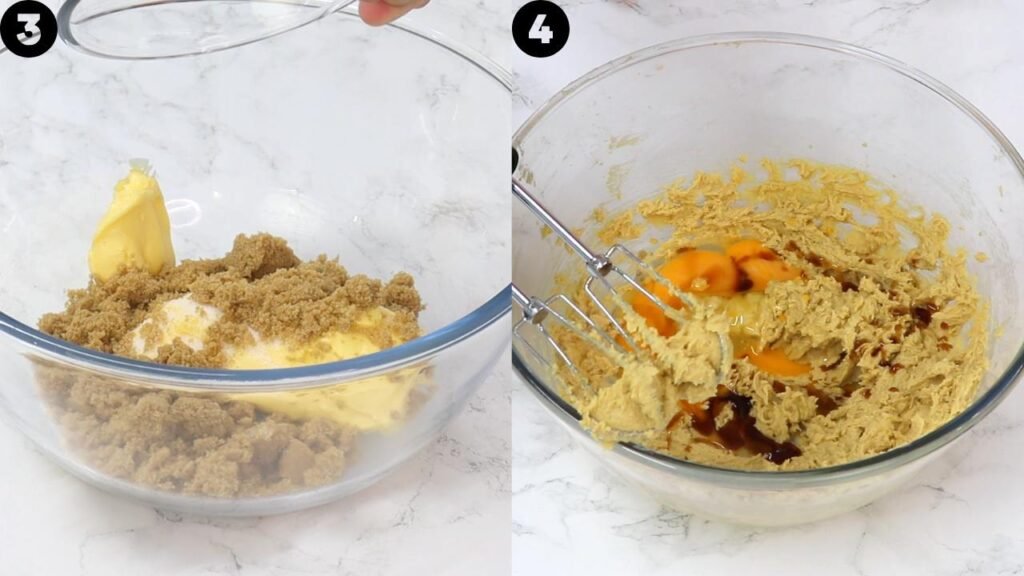 Preheat the oven to 350°F and prepare a round cake pan with parchment paper. In a bowl, mix softened butter with brown sugar and granulated sugar until the texture becomes smooth, creamy, and slightly fluffy.