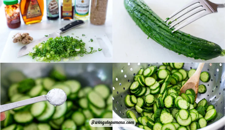 Slice the cucumbers thinly and place them in a bowl. Sprinkle with salt and toss gently. Let them sit for a short time until they release some liquid and begin to soften slightly while still holding their crisp texture.