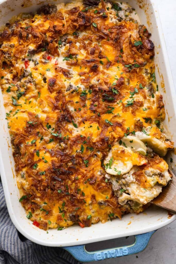 A warm and hearty casserole made with layers of potatoes, seasoned ground beef, and a creamy, cheesy topping. It’s simple, filling, and perfect for family dinners.