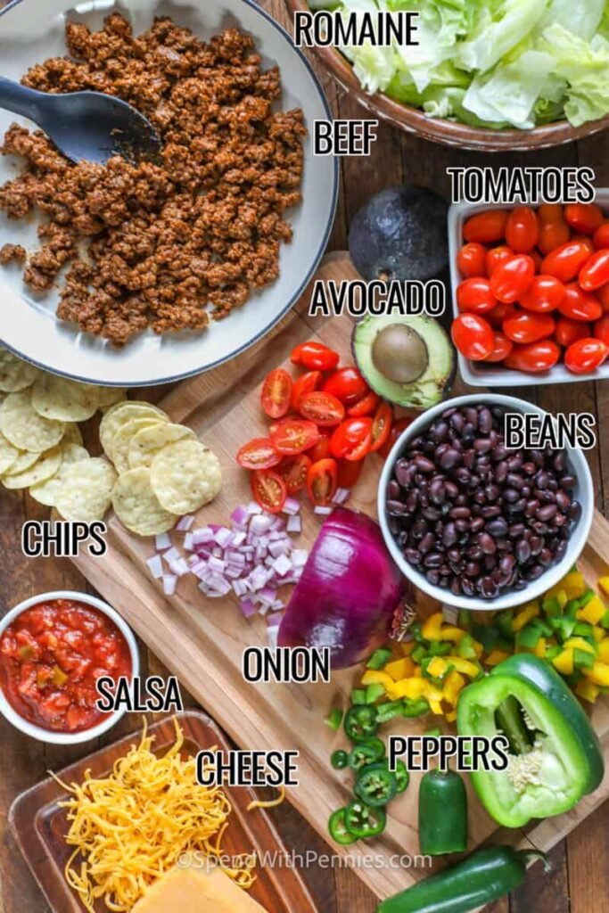 Each serving of taco salad contains roughly 350–500 calories, depending on toppings and portion size. Protein ranges from 18–25 grams due to the beef and beans. It also provides fiber from vegetables and beans. These values are estimates and may vary.